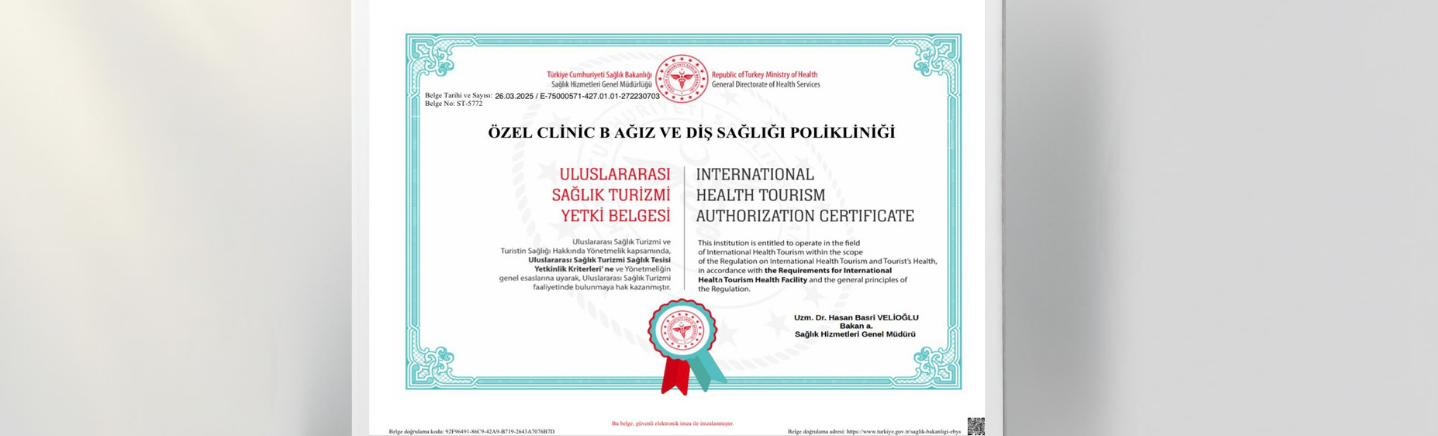 Clinic B Dental olarak, sadece yerel değil, küresel ölçekteki hastalarımıza da Türk misafirperverliğini tıbbi titizlikle harmanlayarak sunuyoruz. T.C. Sağlık Bakanlığı tarafından tarafımıza tevdi edilen "Sağlık Turizmi Yetkinlik Belgesi", kliniğimizin sunduğu hizmet kalitesinin, sterillik protokollerinin ve teknolojik altyapısının uluslararası normlara uygunluğunun resmi tescilidir.